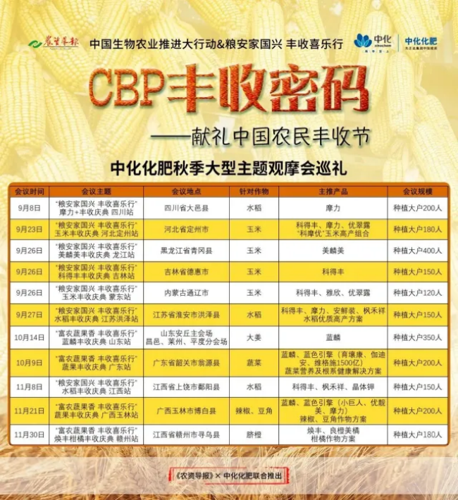 这个(ge)秋天,《农资导报(bao)》中(zhong)国生物(wu)(wu)农业(ye)(ye)推进大(da)行(xing)(xing)动之“CBP丰(feng)收(shou)密码(ma)”系(xi)(xi)列报(bao)道(dao),跟随着中(zhong)化(hua)(hua)化(hua)(hua)肥(fei)覆盖了全国多(duo)个(ge)重要农业(ye)(ye)产区的(de)(de)“丰(feng)收(shou)喜乐行(xing)(xing)”系(xi)(xi)列主题观摩活动,共赴了一场又一场幸(xing)福的(de)(de)丰(feng)收(shou)之旅(lv),共同见(jian)证了中(zhong)化(hua)(hua)化(hua)(hua)肥(fei)的(de)(de)作(zuo)物(wu)(wu)营养解决方(fang)案(an)以(yi)及作(zuo)物(wu)(wu)种肥(fei)药全程方(fang)案(an)的(de)(de)专业(ye)(ye)度与田间(jian)应用效果,也见(jian)证了作(zuo)物(wu)(wu)丰(feng)收(shou)背(bei)后的(de)(de)生物(wu)(wu)力(li)量。